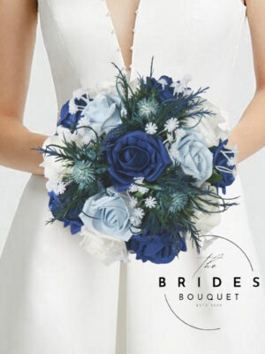 Bridesmaid Bouquets – Blue Thistle & Rose Wedding Posy With Gyp – Choose Rose Colours