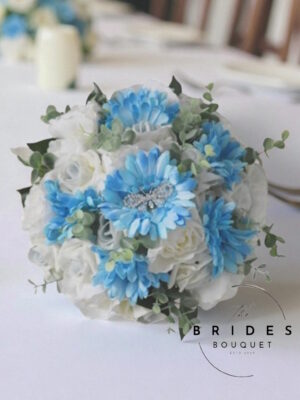 Blue Silk Gerbera, Rose & Camelia Bridal Bouquet With Diamante Butterfly – Ready To Ship
