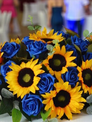 Table Arrangement Flowers – Sunflowers, Eucalyptus & Any Colour Roses