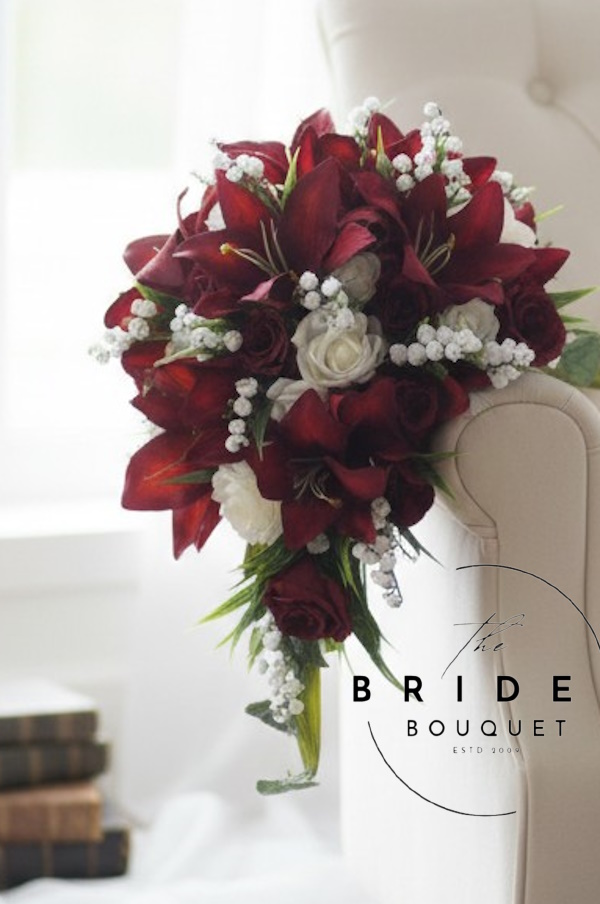 A stunning handmade bridal bouquet featuring silk tiger lilies, roses, and lily of the valley. This teardrop design is tailored to your wedding colours, offering a high-quality, affordable alternative to fresh flowers