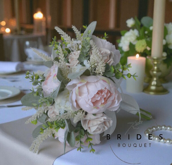Natural Look Artificial Wedding Bouquet Package – Silk Peony, Heather, Roses & Gypsophila