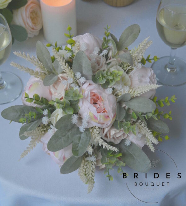 This elegant artificial wedding flower package has a beautiful natural look, perfect for creating timeless bridal flowers you’ll treasure forever. Handmade to order in your chosen colours, the design combines silk peonies, artificial roses, gypsophila and heather with realistic lamb’s ear foliage.