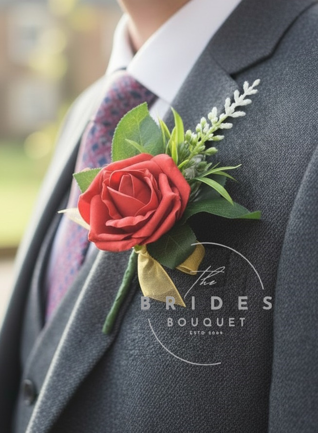 Beautiful faux rose and astilbe wedding buttonholes, handmade to order, choose the rose colour and ribbon to coordinate with your wedding theme