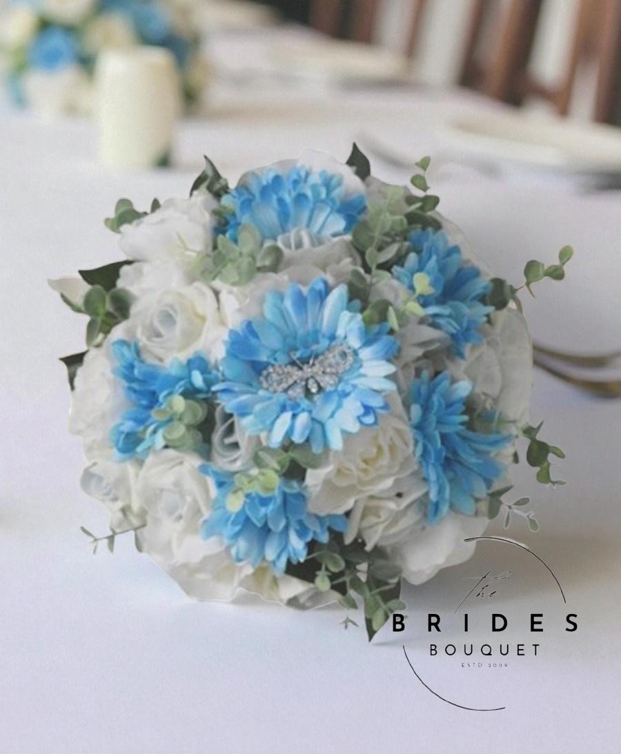 A stunning, pre-finished bridal posy bouquet in pretty pastel blue and ivory tones. One of our Ready to Ship wedding bouquets, this lovely brides posy can be in the post within 24 working hours. Ideal for the bride who needs her flowers delivered fast, with blue gerbera daisies, ivory silk camelia & blue blush faux roses. A diamante butterfly sparkles from the central flower and little sprigs of eucalyptus add further interest into the design.