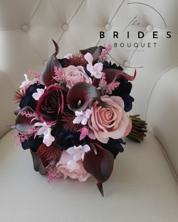 Featuring a mix of silk roses in burgundy, dusty pink and navy, paired with wine calla lilies, pink astilbe, pastel pink jasmine and burgundy thistles, this bouquet offers a rich, elegant colour palette.