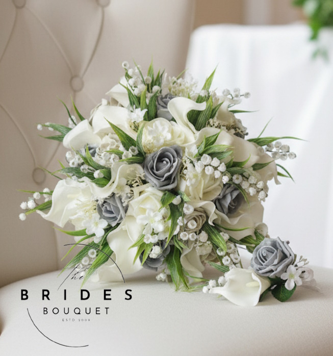 Artificial Bridal Bouquet with Matching Grooms Buttonhole – Any Colours – Roses, Calla Lilies & Lily of the Valley