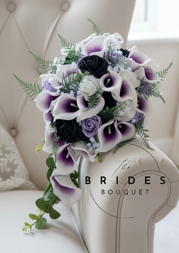 A stunning artificial bridal tear bouquet handmade to order, perfect for brides wanting beautiful, lasting wedding flowers. This elegant bouquet features realistic calla lilies, roses, gypsophila, and foliage, all personalised in your chosen colours to create the perfect bouquets for the bride.