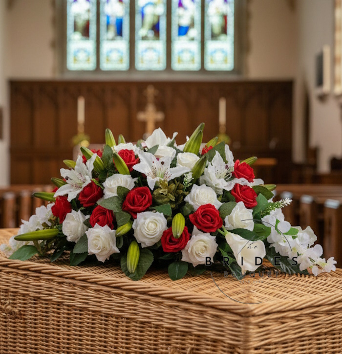 This large casket spray is a respectful and lasting tribute, created using high-quality artificial flowers. Each arrangement is handmade to order in the meaningful colours you choose, allowing you to honour your loved one in a personal way.