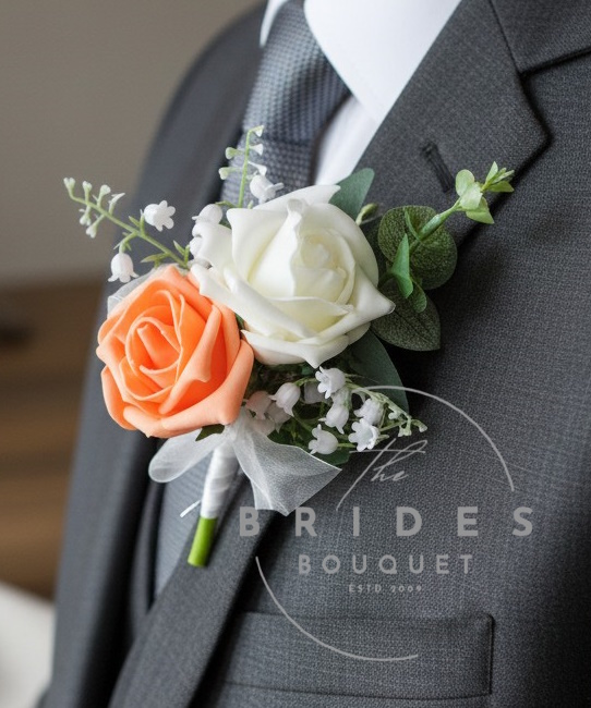 Stunning natural look faux wedding corsage, perfect for the special members of your wedding part. These beautiful pin-on style buttonholes are handmade to order to match your wedding theme. Choose the rose and lily of the valley (or bluebell) colours as well as the embellishments and ribbon shade we use!