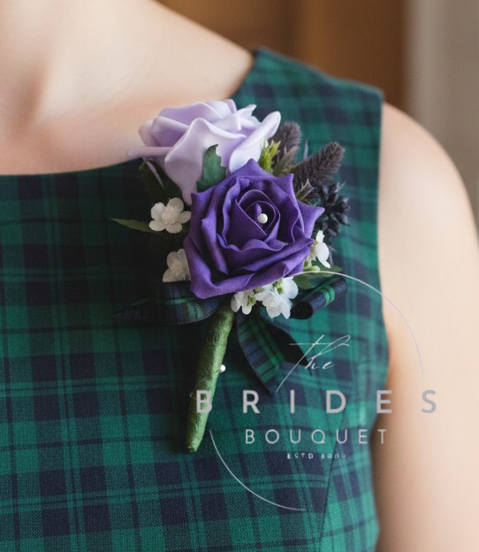 A beautiful artificial wedding flower corsage featuring double artificial roses, Scottish thistle, heather, berries, and sprigs of gypsophila. Handmade to order in your choice of rose and ribbon colours, including tartan ribbon options.