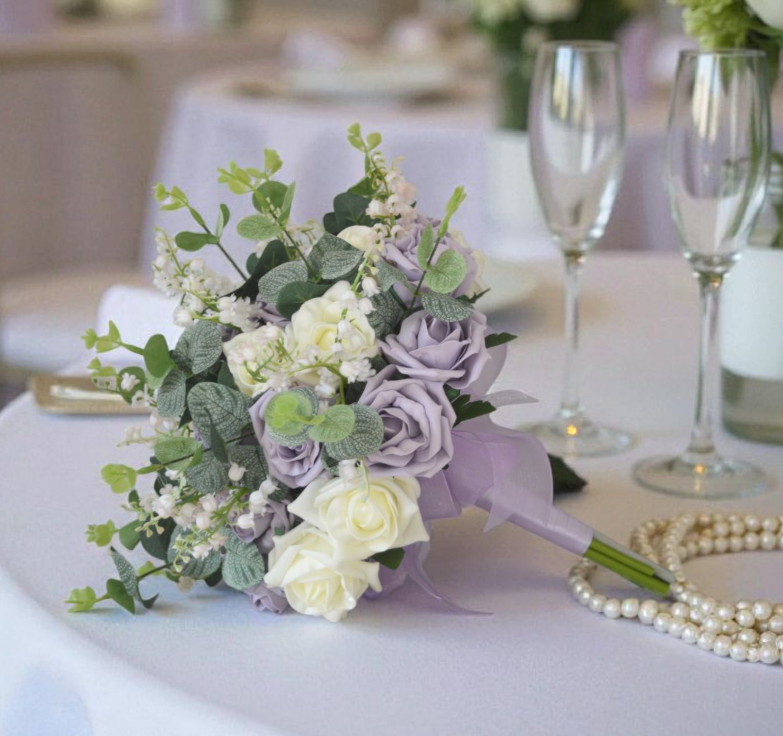 Stunning Wedding Bouquet – Faux Roses, Lily of the Valley & Eucalyptus