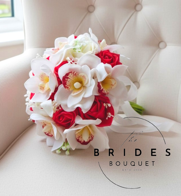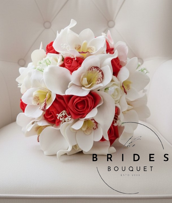 This design combines real touch ivory calla lilies, ivory cymbidium orchids, and coral and ivory roses, finished with gypsophila.