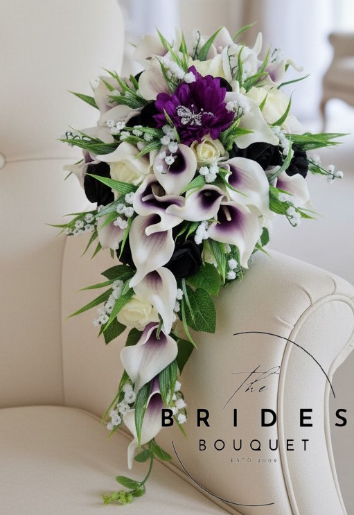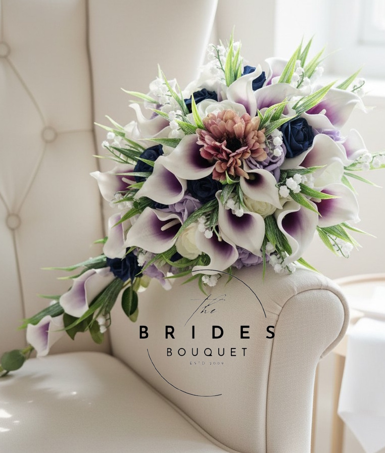 Make your wedding day even more beautiful with this striking artificial teardrop bouquet featuring silk gerbera, real-touch calla lilies, and faux roses. This design also includes lily of the valley for added texture and depth. Each bouquet is handmade to order and personalised to the choices you make