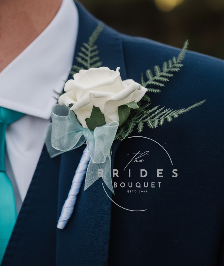 Artificial rose pin-on style corsage that can be created in colours to complement your wedding theme. Perfect for the special guests on your big day, these lovely buttonholes are handmade to order, you get to choose the rose and ribbon colour we use!