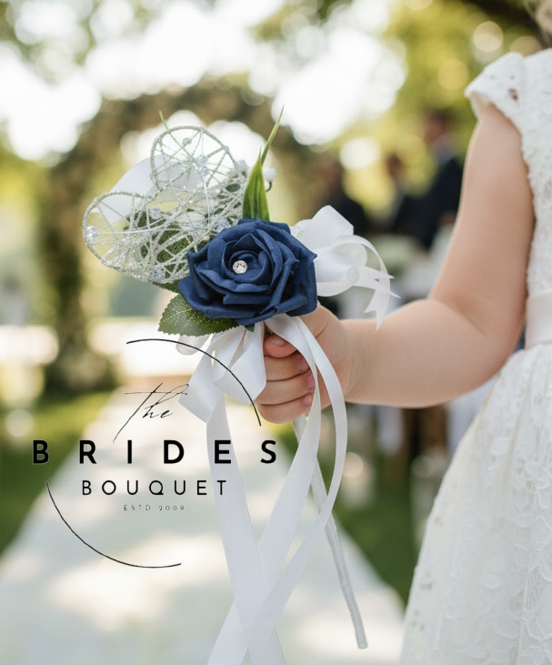 Pretty faux rose wands for your younger bridesmaids and flower girls. Silver Wired Heart wand with rose, lily of the valley and either a coloured silk hydrangea, blue forget me nots or white gypsophila. A lovely design that compliments many of our beautiful bridal flower collections