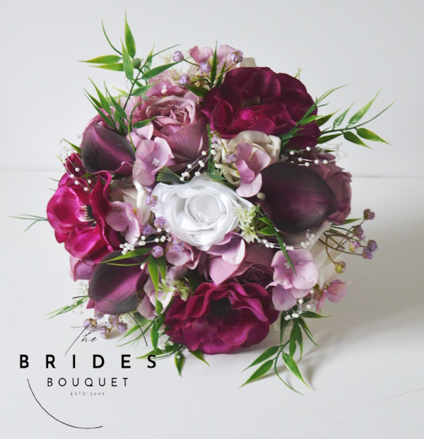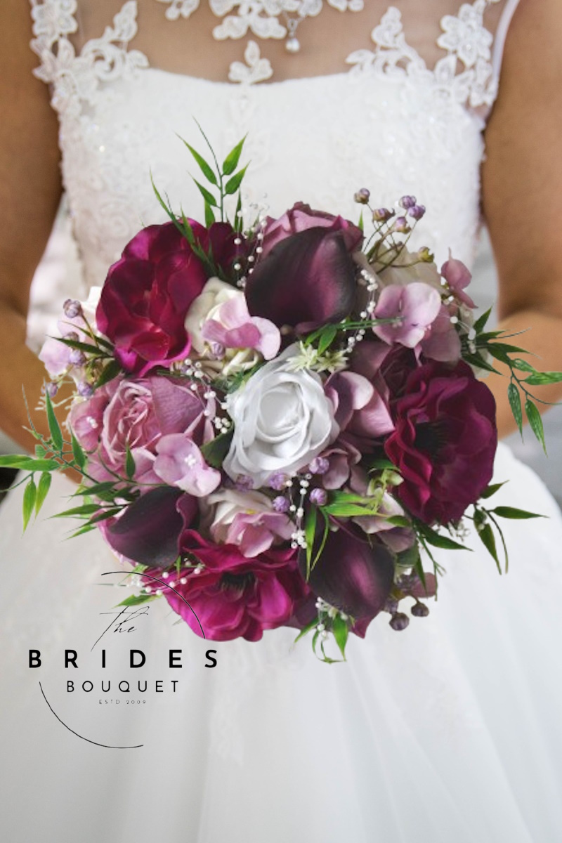 Make a statement on your wedding day with this stunning ready-to-ship bridal bouquet. Perfect for Autumn and Winter weddings, this one-of-a-kind bouquet features a rich mix of deep magenta, mauve, and white silk/artificial flowers, including anemone, calla lily, roses, peony roses, hydrangea, and foliage. Fully finished and ready to ship, the exact flowers shown in the photos are the ones you’ll receive — one only, so be quick! Ideal or the bride to be who needs her wedding bouquet delivered fast, this beautiful bouquet will be in the post within 24 working hours
