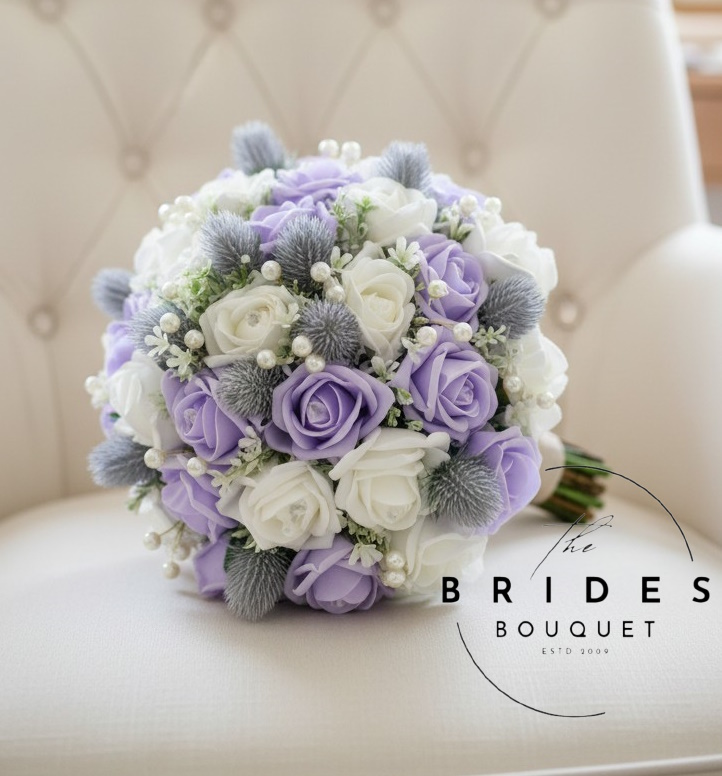 This bouquet is ideal for brides planning a Scottish wedding theme, combining traditional thistles with elegant roses for a striking bridal arrangement.