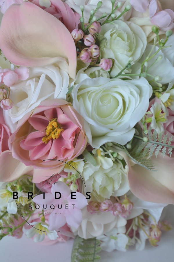 • Mix of silk, faux and real touch flowers including silk roses, real touch blush calla lily, faux roses, gypsophila, jasmine, wildflowers and fern foliage