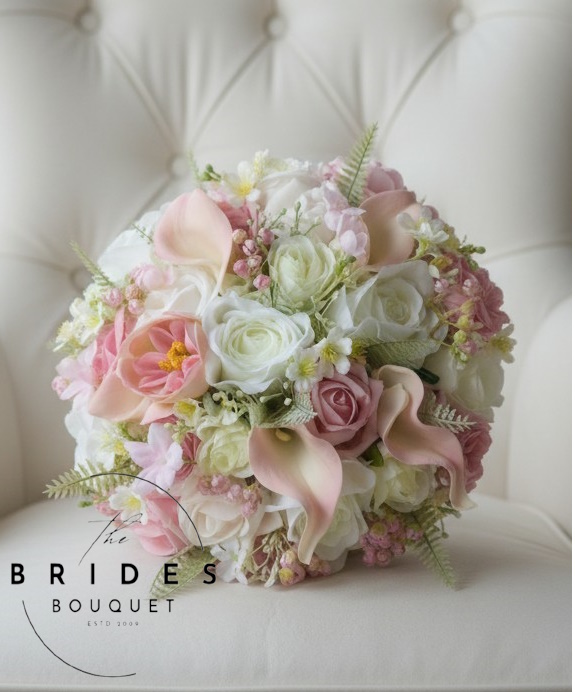 Pastel Pink & Cream Bridal Bouquet – Ready to Ship Silk Wedding Bouquet with Roses & Calla Lily – One Only