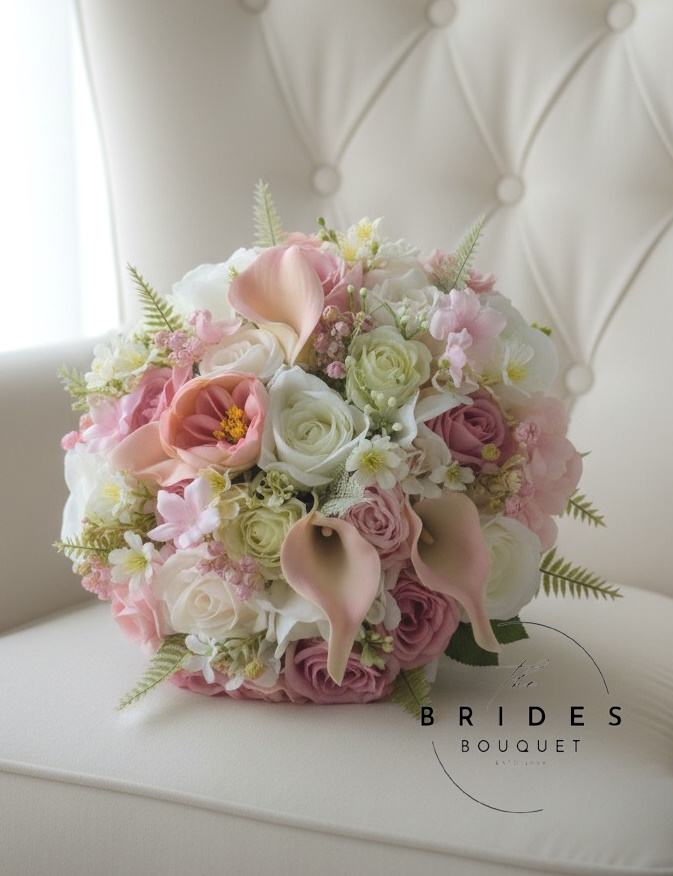 Need a beautiful wedding bouquet quickly? This pastel pink and cream bridal bouquet is ready to post and perfect for brides who want their flowers delivered fast. The bouquet features a romantic mix of pink tones and natural textures. We have carefully arranged the flowers using silk, faux and real touch stems to create a natural-looking bridal bouquet that lasts. This is a one-of-a-kind bouquet. Therefore, the flowers shown in the photographs are the exact bouquet you will receive. If you have chosen a pink wedding theme, this ready-made bouquet is the perfect choice