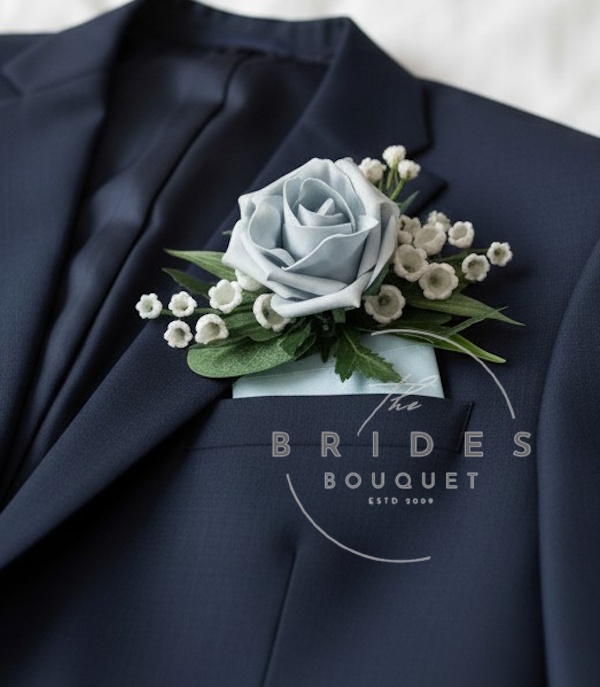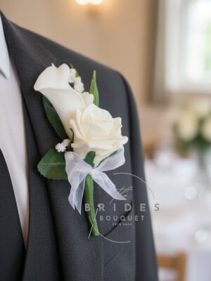 This elegant boutonniere features a beautiful artificial rose in your choice of colour, accented with lily of the valley — designed to perfectly complement our Danielle Range bouquets.
