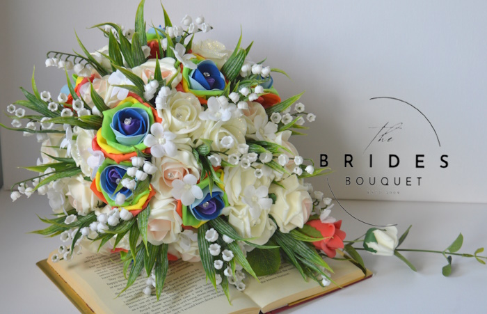 This bouquet offers timeless elegance, a beautifully full shape, and endless colour combinations to suit any wedding palette. Shown in the main photo with pride rainbow, ivory glitter and pink blush roses as per our brides request
