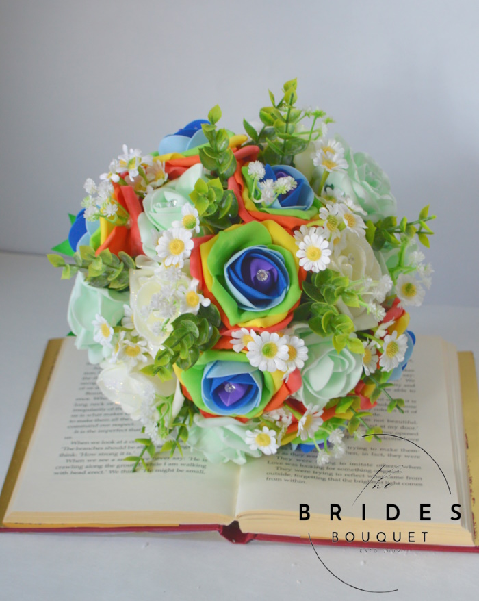 Simply gorgeous bouquets of artificial roses with realistic daisies. Handmade to order in the rose & ribbon colours you choose, these beautiful faux flower bouquets include gypsophila & eucalyptus foliage to create a natural looking, medium posy bouquet, approx 9″ diameter, ideal for your bridesmaids, matron of honour or even the bride to be herself