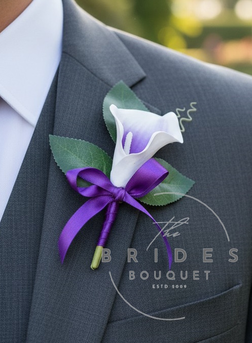 A lovely, highly realistic, real touch Calla Lily in a stylish buttonhole design.Perfect for the special guests to wear on your wedding day. Handmade to order, you choose the calla lily colour as well as the ribbon shade you would like us to use.