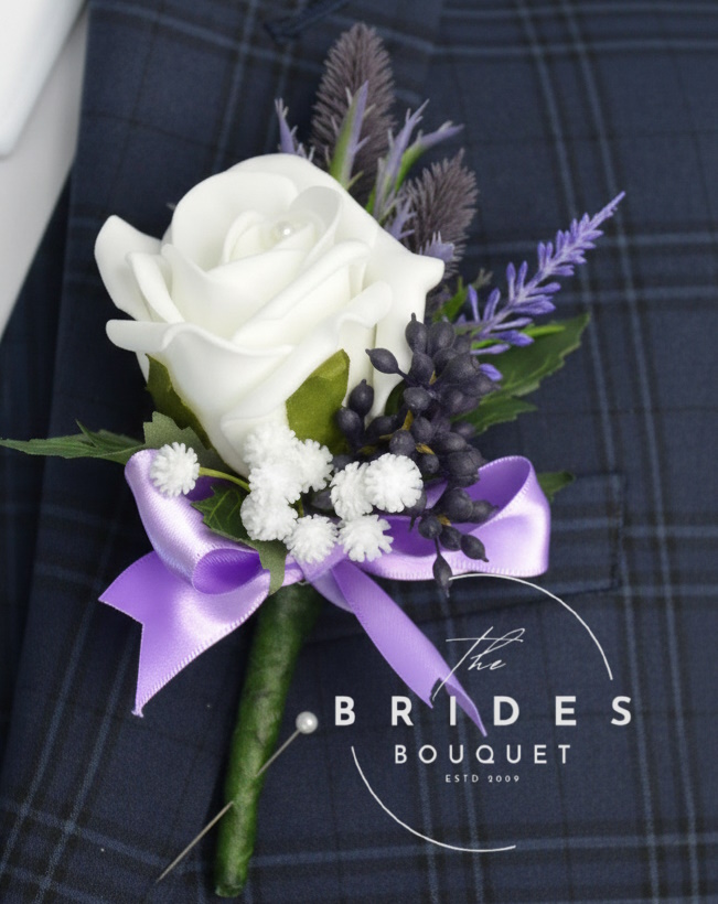 Artificial Wedding Flower Buttonholes – Roses, Thistle, Heather, Berry & Gypsophila