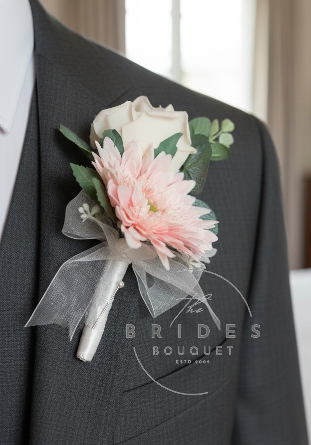 Faux Rose & Mini Silk Gerbera Wedding Buttonholes with Gypsophila & Foliage