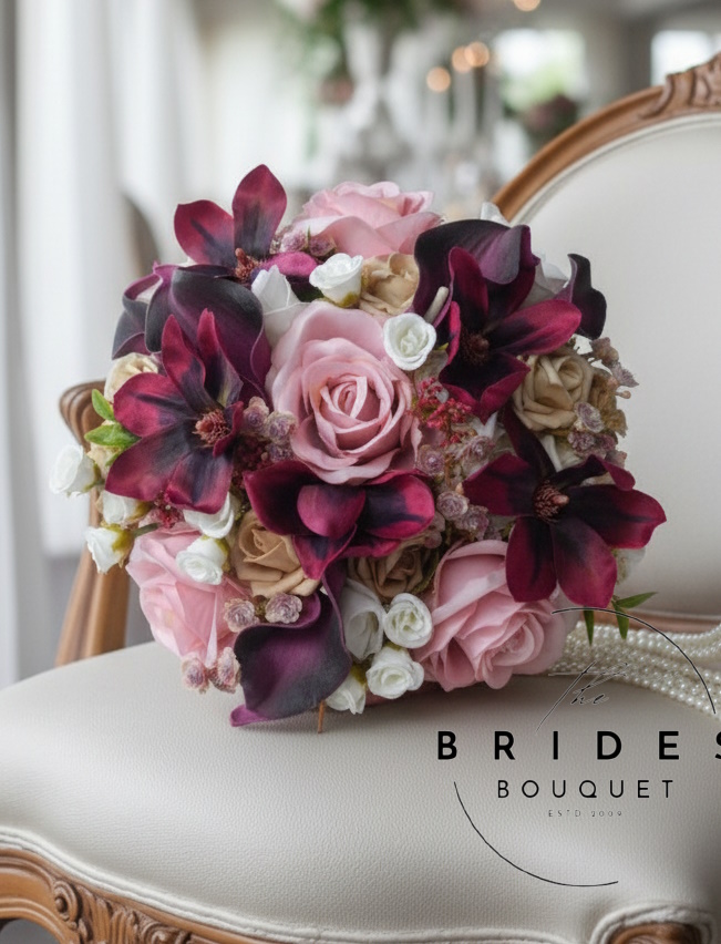 Looking for a stunning silk bridal bouquet that can be delivered fast? Our Ready-to-Ship Wedding Flowers collection offers the perfect solution. This pre-finished bridal posy features a heady mix of deep claret, pink, beige, and ivory tones, including silk magnolia, real touch calla lily, and silk roses. Designed to look natural and fresh, it’s ideal for brides who want a beautiful bouquet without the wait.