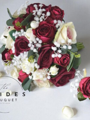 This one-of-a-kind artificial wedding bouquet set is ready to ship – ideal for couples needing elegant flowers quickly. Featuring a rich mix of dusky pink, blush, and raspberry roses, paired with autumn-toned foliage, this bridal bouquet and buttonhole set is perfect for autumn or winter weddings.