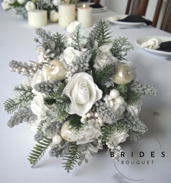 Winter Wedding Bridal Bouquet – White & Silver Christmas Brides Posy, Ready to Ship