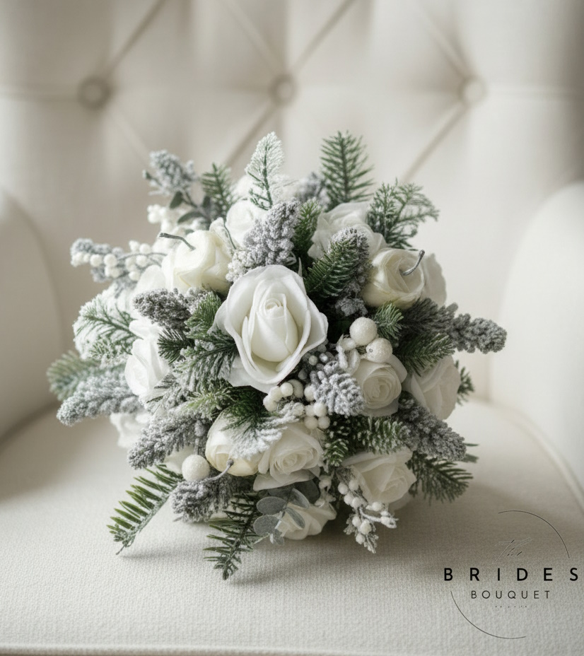 This artificial Winter wedding bouquet combines luxury, elegance, and convenience. Ideal for brides looking for white and silver bridal bouquets that look fresh and festive without the stress of a custom order. Once sold, this one-of-a-kind design will not be repeated — make it yours today!