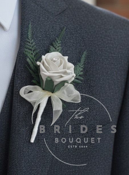 Created using a high-quality faux rose and finished with soft fern foliage, this pin-on buttonhole is suitable for the groom, groomsmen, and all wedding guests.