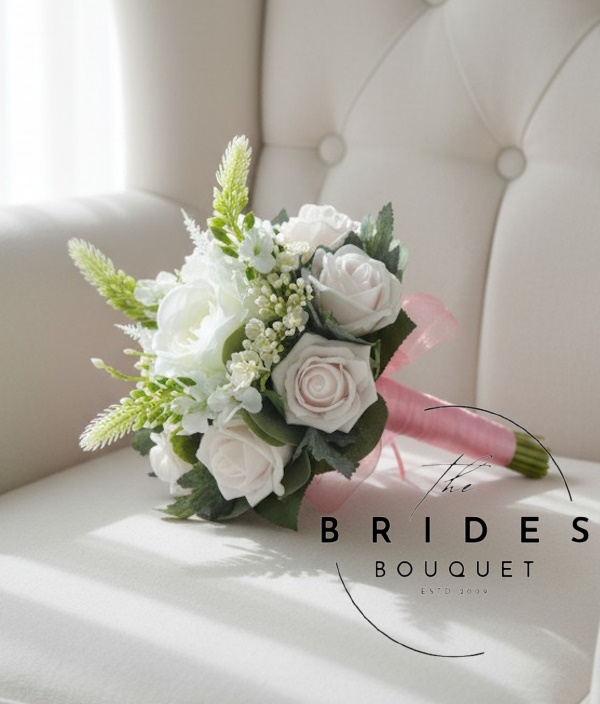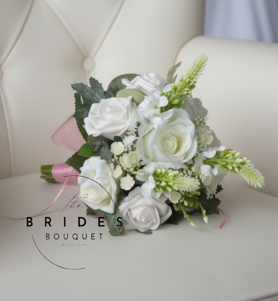 The handle is finished with your choice of ribbon, including plain satin, tartan, or rainbow options. This bouquet keeps its shape and colour, looking beautiful long after the wedding day.
