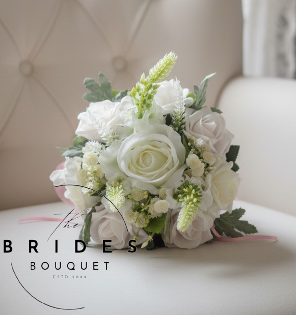 The bouquet includes classic ivory silk roses, with the option to add further faux rose colours. Faux delphiniums, textured astilbe, and realistic foliage complete the natural shape. The bouquet is hand-tied to resemble fresh flowers, perfect for summer weddings and outdoor ceremonies.