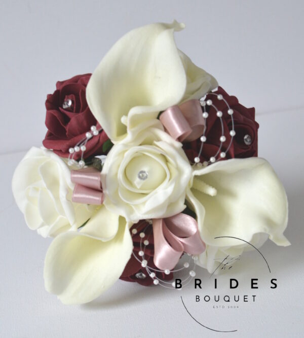 Example shows ivory and burgundy roses with ivory calla, diamante centres to the roses and rose gold ribbon