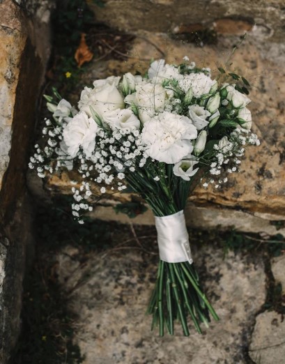 Bespoke order for Emma – bridal bouquet created similar to the flowers in photo examples sent – ivory silk roses in open & bud, lots of gypsophila,foliage lisianthus if available, part wrapped with natural look stems showing – bouquet to be approx 14″ diameter, matching items available to add as optional extras