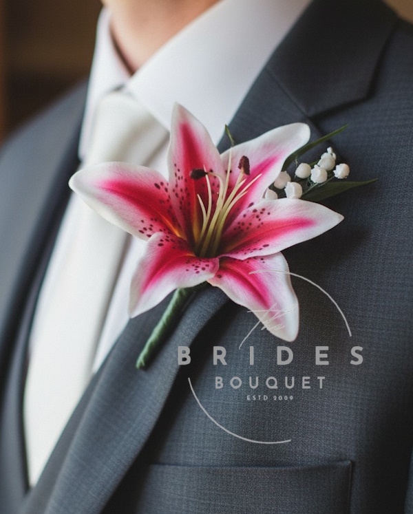 These beautiful silk lily corsages are designed for wedding guests and feature tiger lilies paired with lily of the valley for a natural, elegant look. Each corsage is handmade to order and personalised to the choices you make.