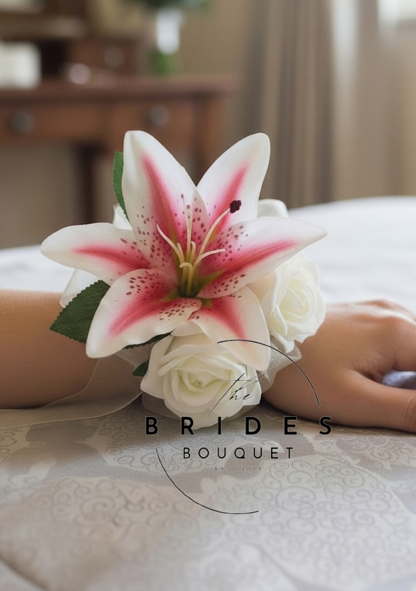Artificial Tiger Lily And Rose Wrist Corsages – Tiger Lily & Roses – Huge Choice Colours Available