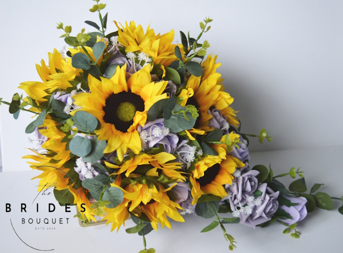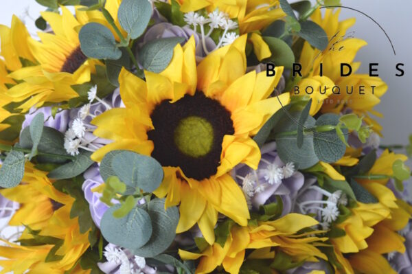 A stunning cascade-style bridal bouquet with a coordinating grooms buttonhole, featuring lifelike silk sunflowers, gypsophila, lush eucalyptus, and roses in your chosen colours — perfectly designed to complement your wedding theme.