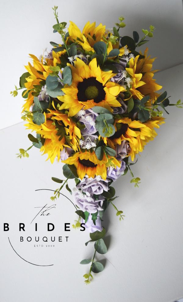 Bridal Teardrop Bouquet with Grooms Buttonhole – Sunflowers, Gyp & Roses – Choose Rose & Ribbon Colours