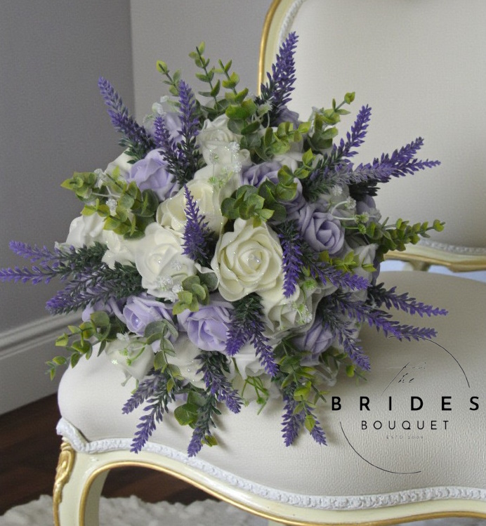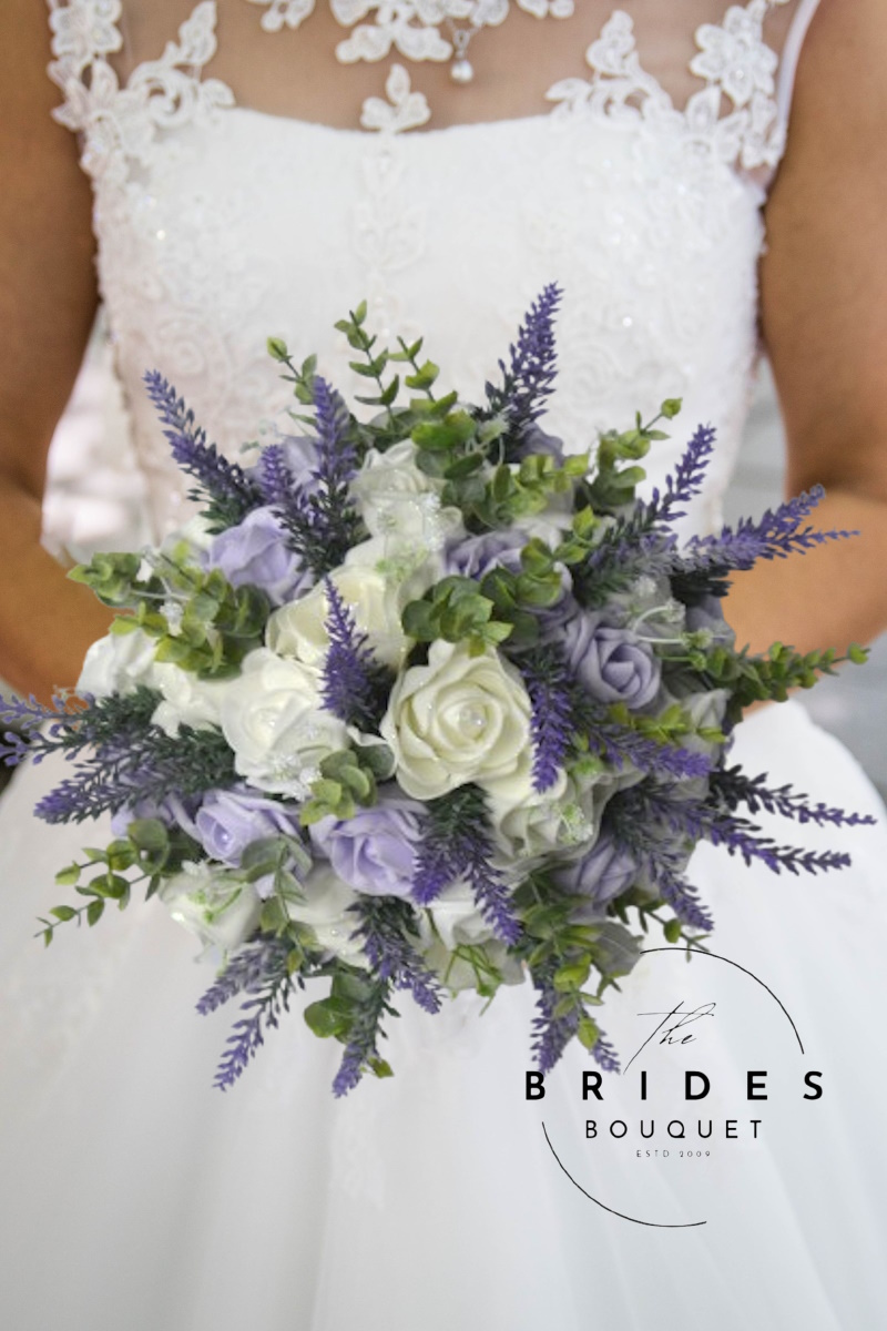 The bouquet shown in the main photo features dusky lilac and ivory roses with lilac/purple heather.