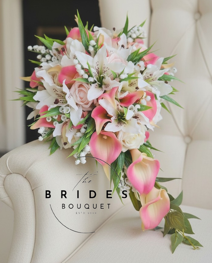 Perfect silk tiger lily bouquet for brides seeking a bespoke, elegant cascade bouquet made to order in the UK.