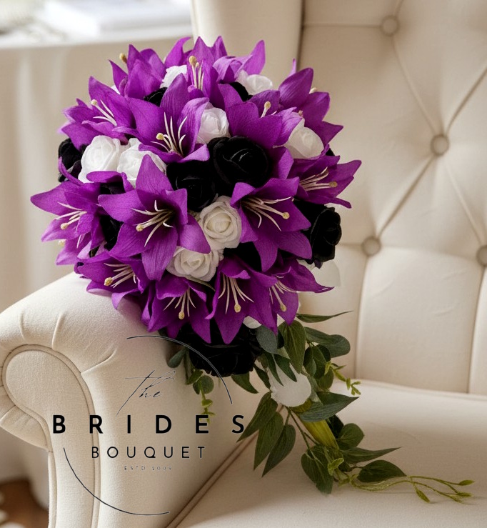 Make a bold and beautiful statement with this handcrafted tiger lily and rose teardrop wedding bouquet. Designed for modern brides who want elegance without compromise, this artificial bridal bouquet features realistic tiger lilies and high-quality faux roses. Handmade to order in the flower and ribbon colours you choose to match your wedding day theme.