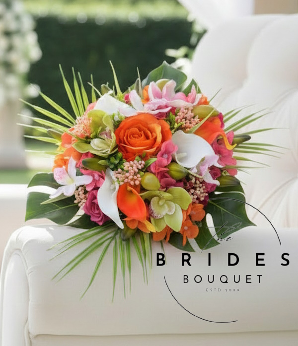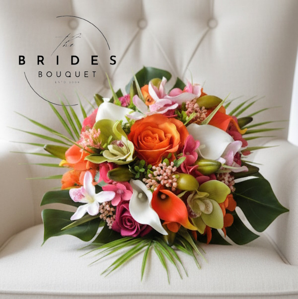 Create a showstopping bridal look with this tropical wedding bouquet designed for destination ceremonies. This one-of-a-kind artificial bouquet blends vibrant orange and pink orchids, roses, and calla lilies, complemented by lush palm and monstera foliage. Carefully arranged and pre-finished, it’s ready to ship within 24 working hours – exactly as shown in the photos.