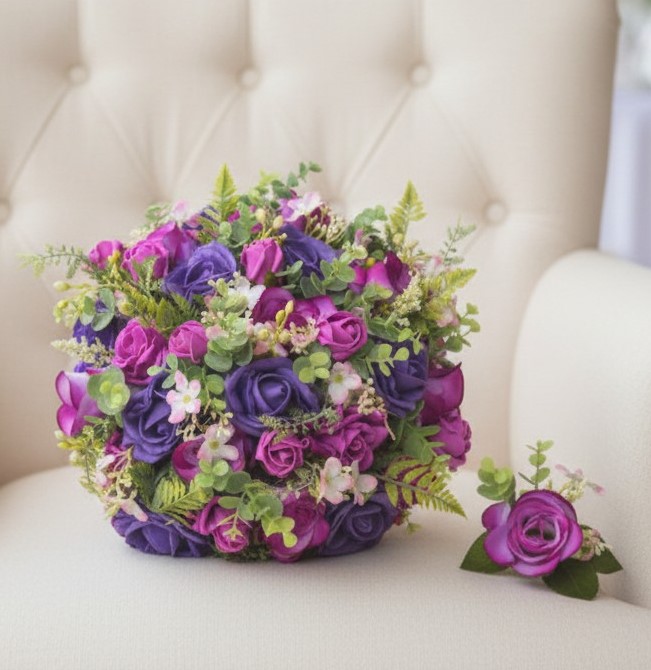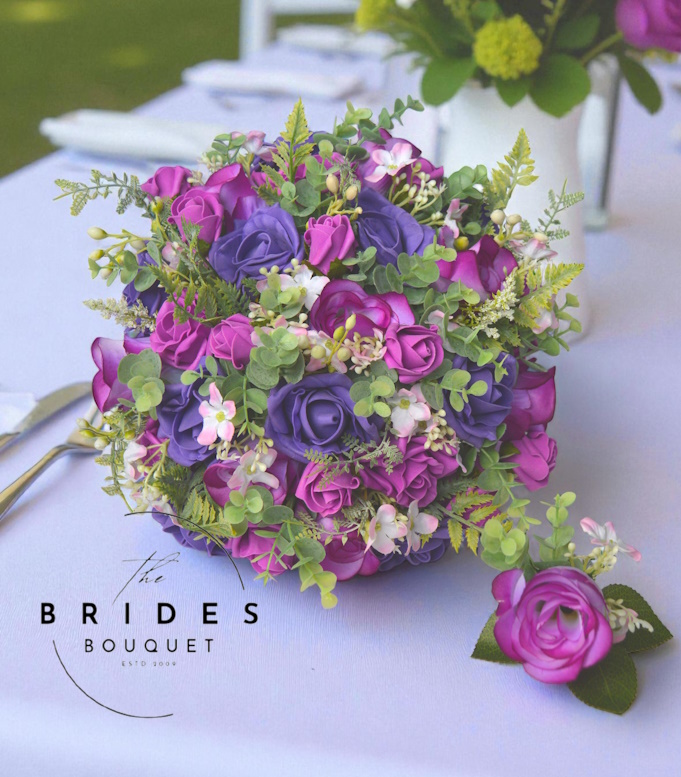 Brides Pre-Finished Wedding Bouquet with Buttonhole – Magenta & Violet Roses with Foliage