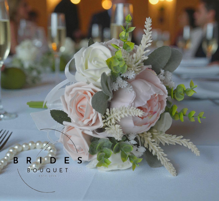 These beautiful, realistic-looking artificial bridal bouquets are simply stunning! Handmade to order in the flower and ribbon colours you choose, this gorgeous design features a mix of silk peonies, faux roses, gypsophila & heather with natural look foliage of lambs ear & eucalyptus! A breathtaking bridesmaid-size bouquet that will wow you & your guest on your big day & be a keepsake for years to come!