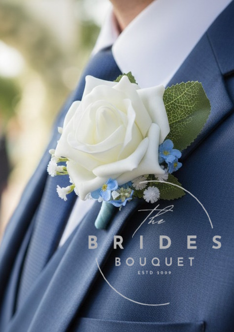 Artificial Wedding Buttonholes – Rose, Gyp & Forget Me Not Pin Corsages